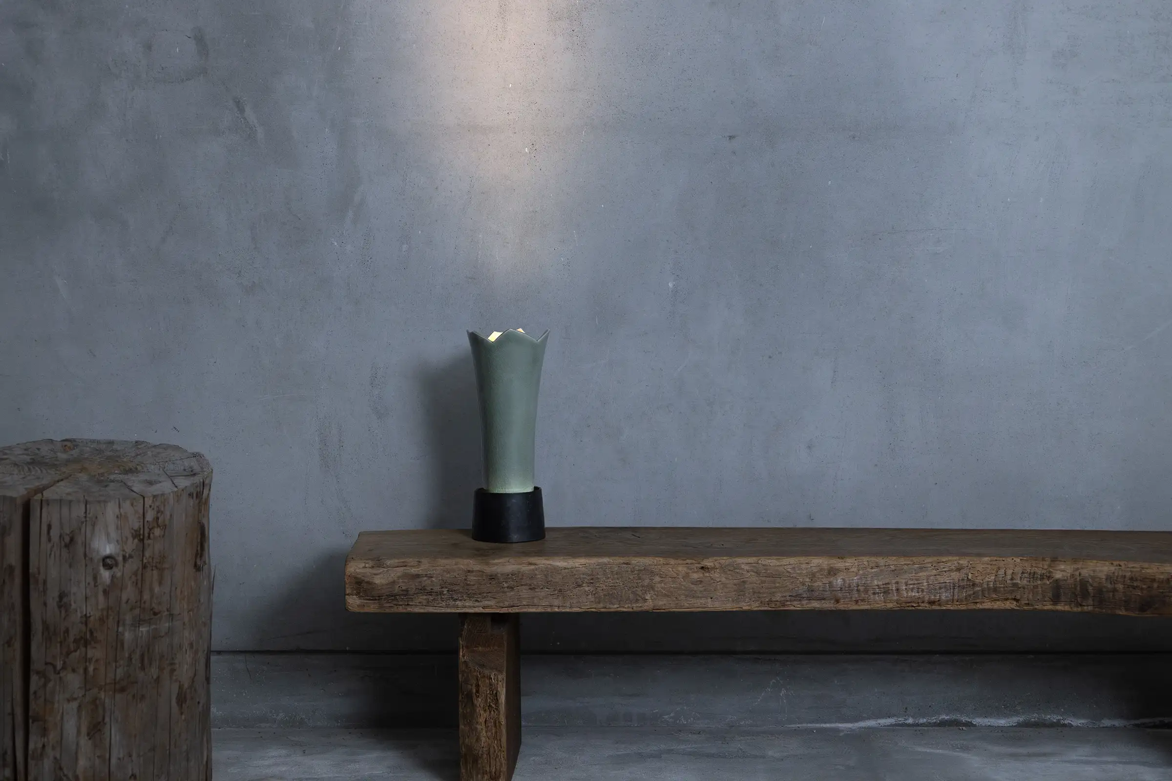 上に向かってゆるやかに広がる造形で空間 上部をやさしく照らします。青ヒビの陶器 にくろがねを合わせました。接合部から明 かりが溢れでる様は、まるで浮遊している かのような印象を与え、素材とフォルム、 光が静かな存在感を生み出しています。筒 状で光の出口が限られているため、壁際や、 空間の入角など、静かな反射と陰影をお愉 しみいただけます。